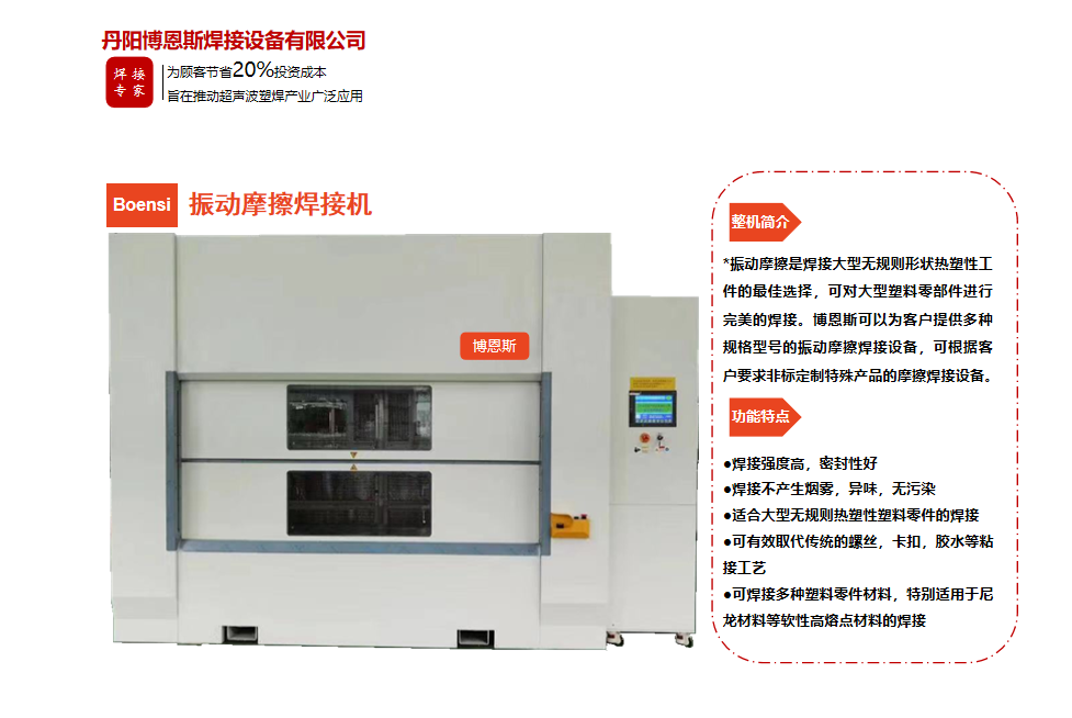 丹陽(yáng)博恩斯焊接設(shè)備有限公司是塑料焊接領(lǐng)域集研發(fā)設(shè)計(jì)、生產(chǎn)制造、銷售服務(wù)為一體的企業(yè)。公司自成立以來(lái)堅(jiān)持“以人為本”的理念,組織了一支強(qiáng)大的技術(shù)研發(fā)團(tuán)隊(duì),攜多年來(lái)積累的豐富經(jīng)驗(yàn),并結(jié)合國(guó)際先進(jìn)塑料焊接技術(shù),根據(jù)市場(chǎng)需要,不斷開(kāi)發(fā)具有核心競(jìng)爭(zhēng)力的新產(chǎn)品。公司具有很強(qiáng)的非標(biāo)機(jī)械研發(fā)、設(shè)計(jì)、生產(chǎn)能力,可為廣大客戶定制各類專用機(jī)械設(shè)備。公司設(shè)計(jì)生產(chǎn)的塑料焊接設(shè)備已廣泛應(yīng)用于汽車、電子、家電、醫(yī)療器械、無(wú)紡布...